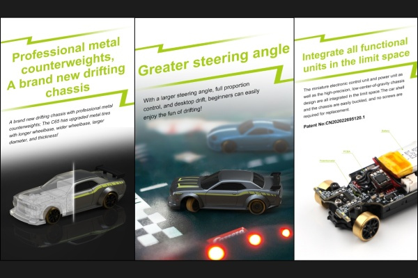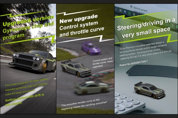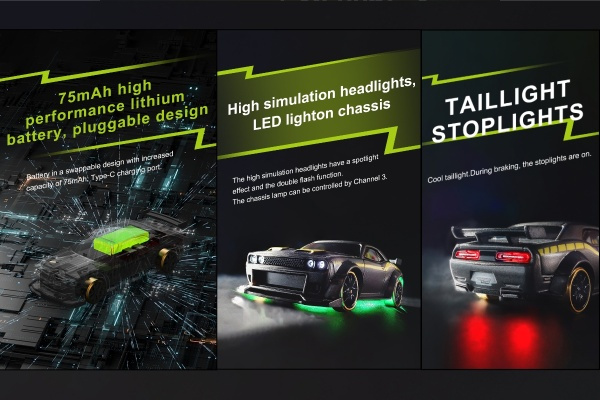 Představujeme první plně proporcionální dálkově ovládané auto velikosti prstu na světě - RC auto 1:76 Turbo Racing. Poprvé v hobby průmyslu s rádiovým ovládáním lze RC vůz takové velikosti ovládat s takovou přesností a jemností. Díky zcela novému patentovanému systému řízení potenciometrem, který je nejmenší svého druhu, můžete ovládat vozidlo přesně tak, jak chcete.Lithiový akumulátor poskytuje výkon a rychlost pro skvělý zážitek z jízdy a spoustu zábavy. Závoďte s těmito RC vozy o velikosti prstu kdekoli - doma, v kanceláři, v obchodním domě, nebo třeba na závodní dráze.Rádiový systém Turbo Racing 2,4 GHz umožňuje závodit až pěti RC pilotům najednou. Na jedno nabití můžete jezdit až 30 minut. Model disponuje přesným proporcionálním řízením a ovládáním plynu, jaké byste očekávali od větších RC automobilů, a nabíjí se jako váš smartphone pomocí připojení USB–C. Skvělá zábava pro závodění s přáteli a rodinou doma, v kanceláři s kolegy, na cestách nebo téměř kdekoli, kde vás jen napadne!Mini auto v měřítku 1:76 je připraveno okamžitě k jízdě. Jednoduše vložte čtyři alkalické baterie AAA do dálkového ovladače a jste připraveni si užít zcela nový druh zábavy!Tento model navíc obsahuje vestavěný gyroskop a kluzká kola, díky kterým můžete zatáčky projíždět kontrolovaným smykem!Jedná se o v pořadí třetí DRIFT generaci, která má vylepšené jízdní vlastnosti.Funkce:Plně proporcionální ovládáníRWD náhon, vylepšený vestavěný gyroskop, zvýšený úhel zatáčení a kluzká kola pro jízdu v driftuProdloužený rozvor náprav, tlumiče předních kol, zvýšený výkon motoru a křivka plynu pro plynulejší ovládáníNeony, přední světla a zadní světla přepínatelné z vysílačeVyměnitelný lithiový 75mAh akumulátorNabíjecí port USB– C, nabíjejte pomocí přenosných Power bank, notebooků, nabíječek telefonů apod.30min výdrž baterie pro maximální zábavu a zážitek z jízdyRozložitelný čtyřkanálový vysílač dálkového ovládání Turbo Racing P21-SVCSada obsahuje dvě nelakované karoserie pro realizaci vlastní představivosti Technické specifikace:Měřítko: 1:76Hmotnost auta: 21 gProvozní vzdálenost: 30 mDoba jízdy: až 30 minÚhel řízení: 45 °Pohon: zadních kolProporcionální řízení a ovládání plynuVelikost: 67,5x28,8x19,5 mmTyp baterie: Li-Po 3,7 VKapacita baterie: 75 mAhNabíjení: USB–C (součástí balení)Plné nabití: cca 30 m2,4GHz FHSS 4kanálový rádiový vysílačVelikost vysílače: 171x138x73 mm Obsah balení:Model auta (podvozek a lakovaná karoserie)RC vysílač 2,4GHzNabíjecí kabel USB–C.1x Sponka1x Šroubovák2x Náhradní karoserie (nebarvené bílé)Návod k použití Vyžaduje k zprovoznění:4x AAA baterie (pro vysílač)