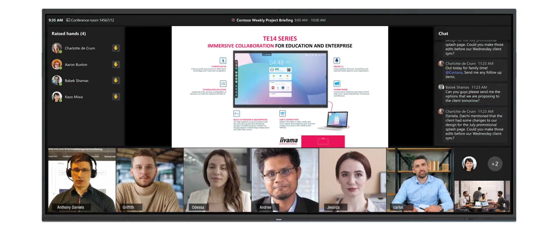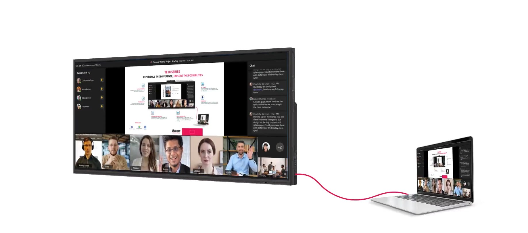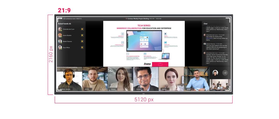 Díky ultraširokoúhlému poměru stran poskytuje tato interaktivní dotyková obrazovka rozsáhlé plátno pro umístění více oken obsahu vedle sebe, což zlepšuje možnosti multitaskingu. Formát 21:9 Ultra Wide je také dokonalou optimalizací pro Microsoft Teams Front Row, která všem účastníkům přináší výjimečný zážitek a rovnost zasedací místnosti.