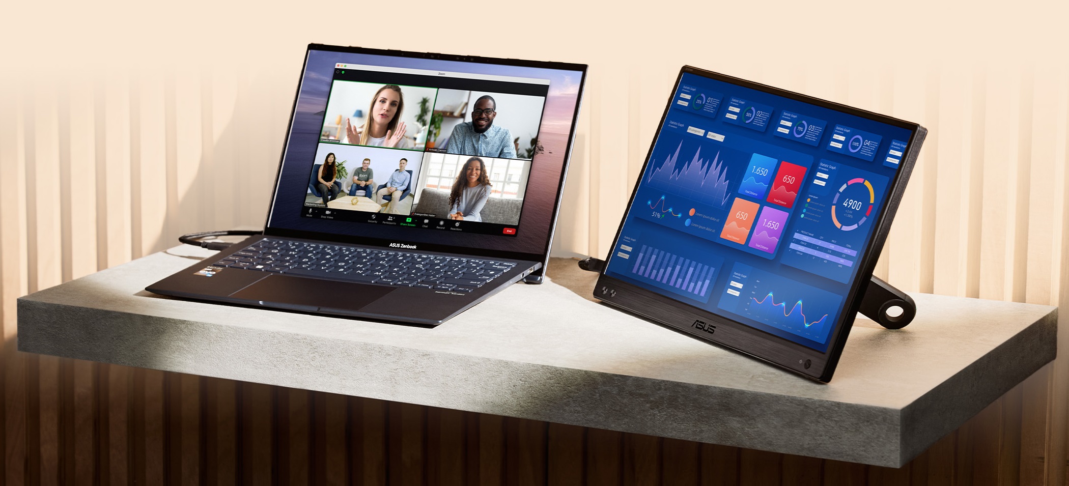 ASUS ZenScreen je ideální pro život na cestách. Tento elegantní přenosný displej je lehký a má tenký profil, takže se snadno vejde do každé cestovní tašky a je připraven k produktivitě kdykoli a kdekoli.