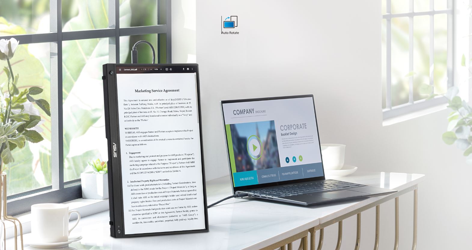 Monitor ASUS ZenScreen MB16AHG je vybaven G-senzorem, který automaticky detekuje jeho orientaci a při připojení k mobilním zařízením přepíná displej mezi režimy na šířku a na výšku. Režim na šířku je ideální pro prezentace a tabulky, zatímco režim na výšku umožňuje ideální zobrazení dokumentů, knih nebo webových stránek.