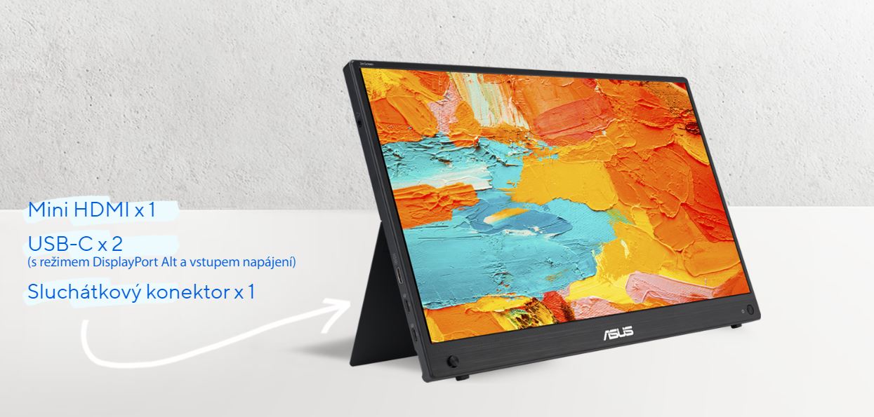 ASUS ZenScreen MB16AHG je vybaven řadou vstupních/výstupních portů pro připojení různých zařízení. Port USB-C umožňuje přenos audio-video signálů pomocí jediného kabelu. K dispozici je také port mini HDMI pro připojení různých vstupních zdrojů kabelem.