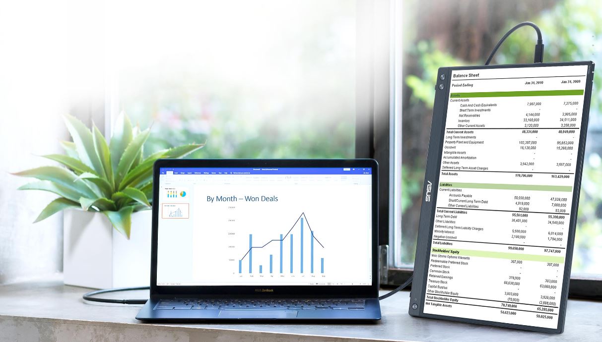 ASUS ZenScreen™ MB16AHV je ideální pro život na cestách. Tento elegantní přenosný displej váží pouhých 0,9 kg a má tenký profil 10,5 mm, takže se snadno vejde do každé cestovní tašky a je připraven k práci kdykoli a kdekoli.