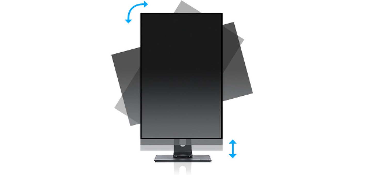 Stojan s regulací výšky umožňuje přizpůsobení umístění obrazovky podle vlastních preferencí. To zaručuje komfort práce s monitorem a má příznivý vliv na zdravotní stav vaší páteře. Otáčení obrazovky umožňuje změnu polohy obrazovky z vodorovné (krajina) do svislé (portrét). Tato funkce je výhodná obzvláště při práci s dlouhými listy nebo texty.