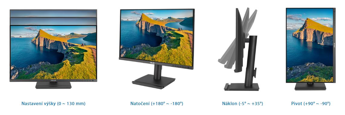 FlexibilnĂ nastavenĂ náklonu, natoÄŤenĂ, výšky a funkce pivot usnadĹuje nalezenĂ nejpohodlnÄ›jšà polohy pro sledovánĂ. Monitor lze takĂ© otoÄŤit o celĂ˝ch 90° do orientace na výšku, coĹľ je ideálnĂ pro práci s dlouhĂ˝mi dokumenty, programovánĂ nebo prohlĂĹľenĂ webovĂ˝ch stránek.