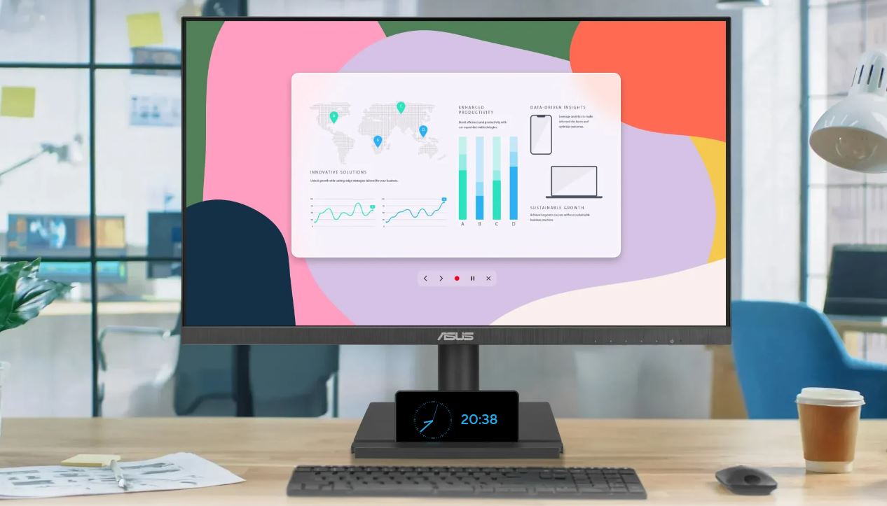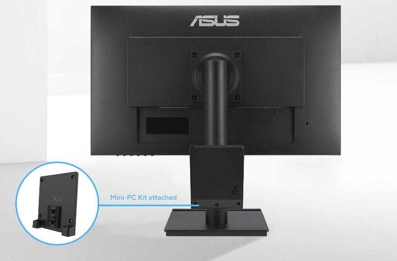 Vybrané monitory ASUS jsou kompatibilní s volitelnou sadou mini-PC (MKT03) navrženou společností ASUS, která uživatelům umožňuje připevnit NUC / Mini-PC na zadní stranu stojanu monitoru, čímž je pracovní plocha přehledná s ušetřeným místem.