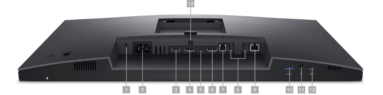1. Slot pro bezpečnostní zámek (na základě Kensington Security Slot™) | 2. Napájecí konektor | 3. HDMI | 4. DisplayPort 1.2 | 5. USB 3.2 Gen 1 Type-C (Alt mód s funkcí DP 1.2, napájení až 90W) | 6. DisplayPort (out) | 7. Upstream USB 3.2 Gen 1 typu B | 8. USB 3.2 Gen 1 typu A (2) | 9. RJ45 | 10. USB 3.2 Gen 1 typu A | 11. Konektor náhlavní soupravy | 12. USB 3.2 Gen 1 Type-C downstream (napájení až 15W) | 13. Zámek stojanu