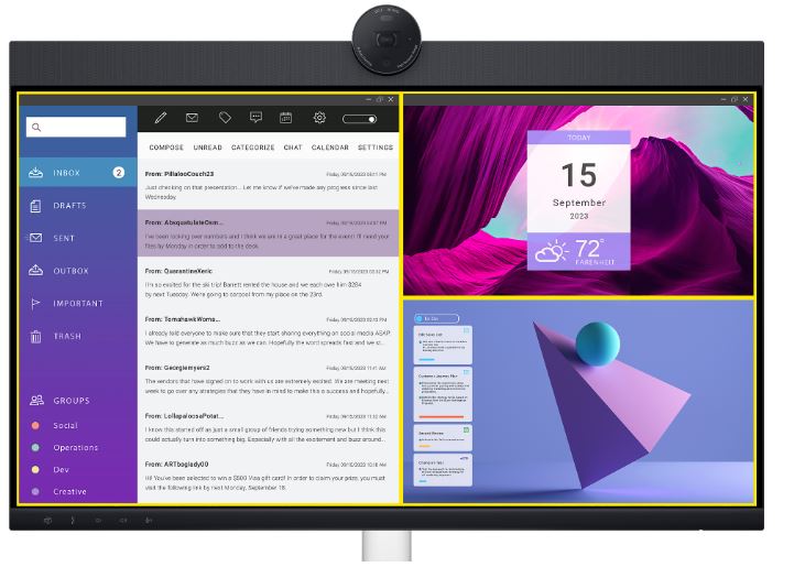 Hlasitě a čistě: Spolupracujte, jako byste tam byli, díky vestavěným mikrofonům s duálním potlačením ozvěny a dvěma 5W reproduktorům, strategicky umístěným v horní části monitoru pro pohlcující zvukový zážitek.