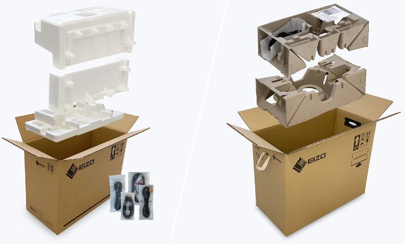 Společnost EIZO používá pro obal CS2400S polstrování z celulózy. Materiál je vyroben z recyklované lepenky a papíru a při likvidaci má mnohem menší dopad na životní prostředí než tradiční polystyren nebo plast. Všechny kabely jsou uloženy v kartónové přihrádce, místo aby byly jednotlivě baleny v plastových sáčcích.