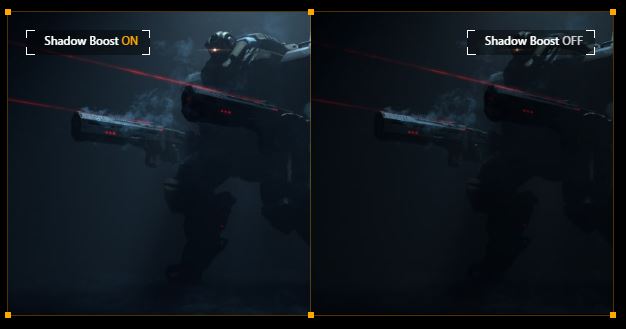 Technologie ASUS Shadow Boost vyjasňuje tmavé oblasti hry bez přeexponování světlých oblastí, zlepšuje celkové zobrazení a zároveň usnadňuje odhalování nepřátel skrytých v tmavých oblastech mapy.