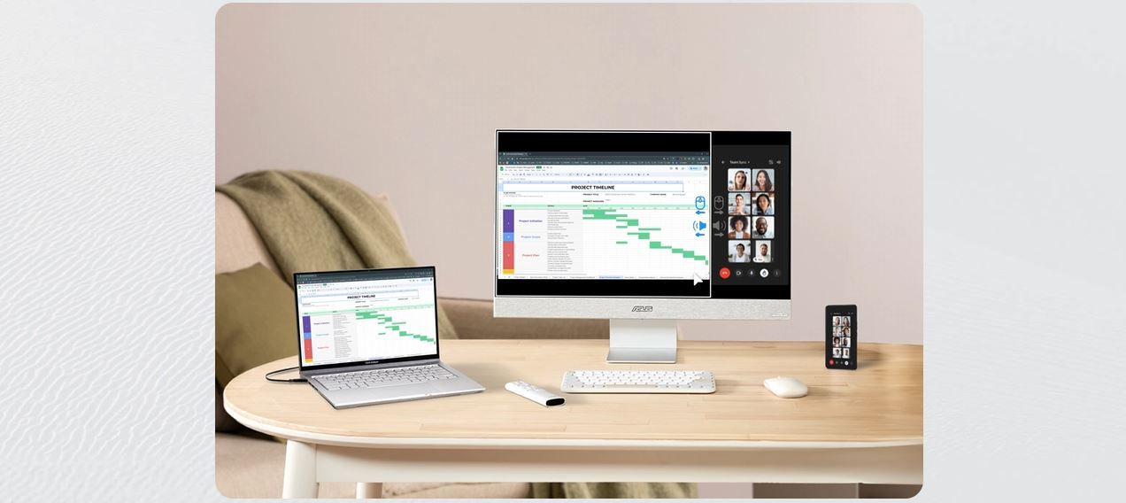 Zvyšte svůj multitasking ovládáním více zařízení pomocí jediné myši a klávesnice. Zažijte efektivní pracovní postup s jednotnou řídicí stanicí pro ZenScreen Smart MS27UC, váš telefon a notebook!