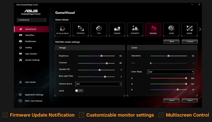 Technologie ASUS GameVisual nabĂzĂ osm pĹ™ednastavenĂ˝ch reĹľimĹŻ zobrazenĂ, kterĂ© vylepšujĂ vizuálnĂ stránku rĹŻznĂ˝ch typĹŻ obsahu. Mezi reĹľimy lze snadno pĹ™epĂnat pomocĂ klávesovĂ© zkratky nebo nabĂdky OSD.