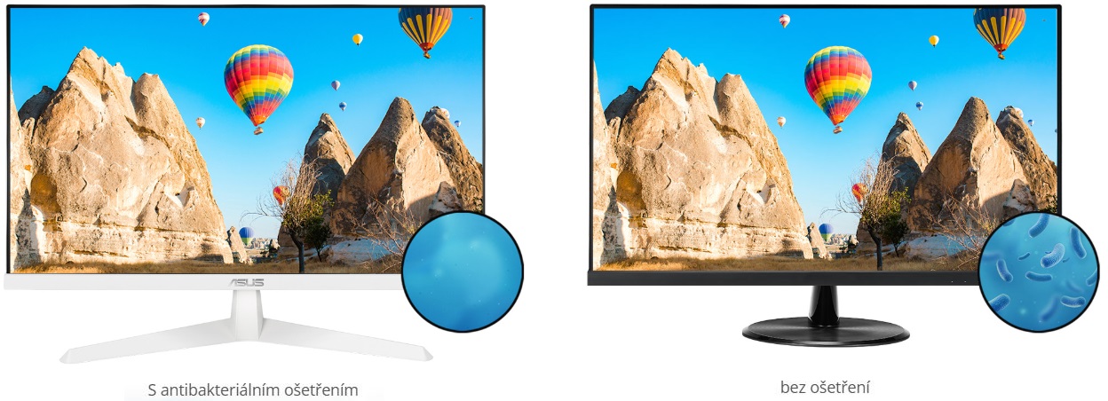 Rámečky a klávesové zkratky na VY279HF-W mají antibakteriální úpravu iontovým stříbrem. Tím, že zabraňuje ulpívání bakterií až o 99,9 %, udržuje klíčové oblasti monitoru čisté a hygienické, což potenciálně snižuje šíření škodlivých bakterií.