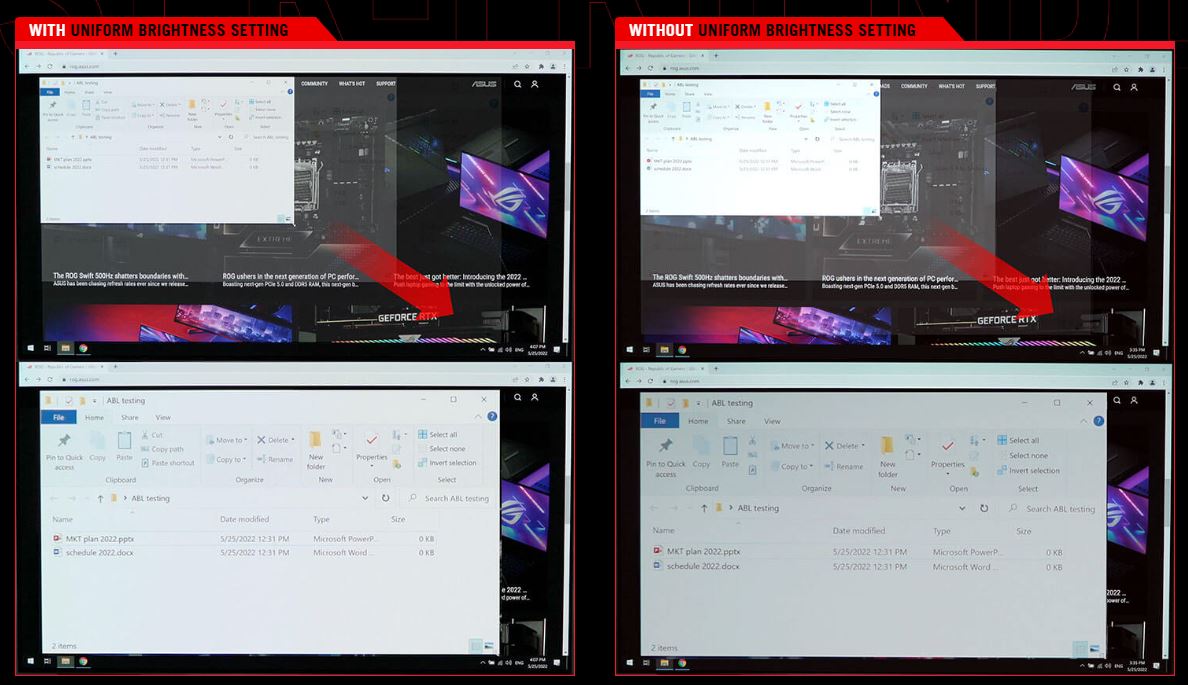Po aktivaci exkluzivní funkce ROG Rovnoměrný jas v nabídce OSD snižuje maximální jas, aby se udržela konzistentní úroveň pro lepší prohlížení – a to i při změně velikosti jasně bílých oken. Díky tomu jsou také maratonské herní seance mnohem příjemnější pro oči.