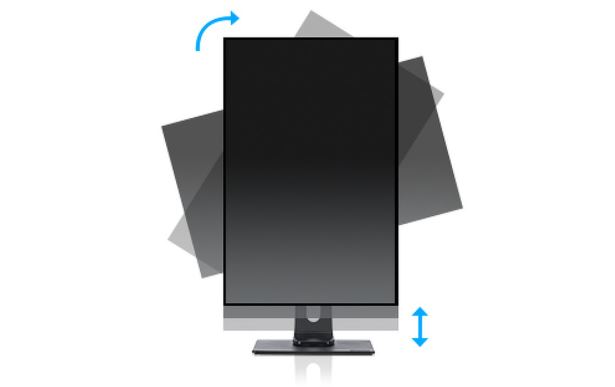 Stojan s regulací výšky umožňuje přizpůsobení umístění obrazovky podle vlastních preferencí. To zaručuje komfort práce s monitorem a má příznivý vliv na zdravotní stav vaší páteře. Otáčení obrazovky umožňuje změnu polohy obrazovky z vodorovné (krajina) do svislé (portrét). Tato funkce je výhodná obzvláště při práci s dlouhými listy nebo texty.