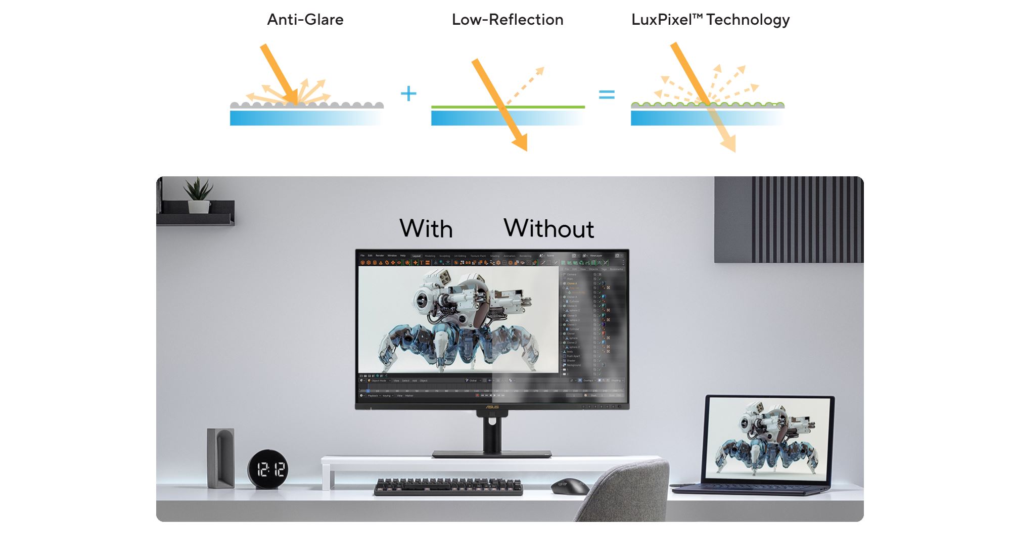 Technologie LuxPixel™ je antireflexní vrstva s nízkým odrazem (AGLR), která poskytuje efekt obrazovky podobný papíru. Na rozdíl od tradičních matných panelů, které často zjemňují obraz, technologie LuxPixel™ minimalizuje odrazy, aby uživatel viděl přesné barvy a ostré detaily.