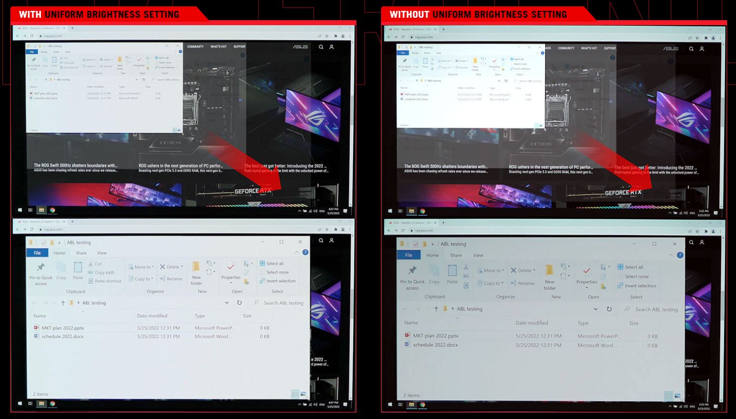 Po aktivaci nastavení Uniform Brightness* (Rovnoměrný jas) exkluzivního pro ROG v nabídce OSD se sníží maximální jas, aby se zachovala konzistentní úroveň pro lepší sledování – i při změně velikosti jasných bílých oken. Díky tomu jsou maratónské herní seance mnohem příjemnější pro oči.