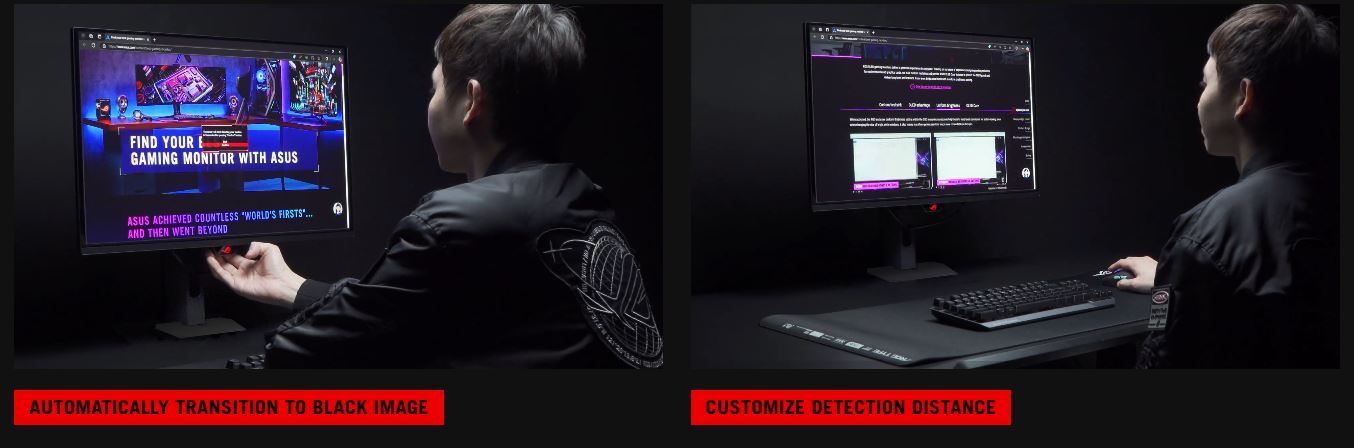 Nová technologie ASUS OLED Care Pro poskytuje kompletní sadu přizpůsobitelných nastavení monitoru, která chrání panel OLED a zajišťují jeho dlouhou životnost. Navíc obsahuje nový senzor Neo Proximity Sensor, který detekuje vaši vzdálenost od monitoru a při vaší nepřítomnosti přepne obraz na černou barvu, aby chránil panel před vypálením. Všechna nastavení lze snadno spravovat prostřednictvím DisplayWidget Center.