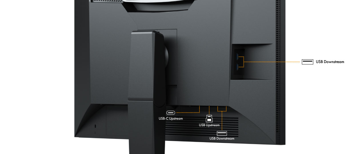 Rozhraní USB-C přenáší z počítače kromě běžných dat USB navíc ještě obrazový signál DisplayPort a zvukový signál. Díky tomu postačí k propojení monitoru s počítačem vybaveným rozhraním USB-C pouze jediný kabel. Pro upstream je navíc k dispozici ještě rozhraní USB-B. Na straně downstreamu může uživatel monitoru CS2731 využít dva konektory USB-B a dva konektory USB-A.