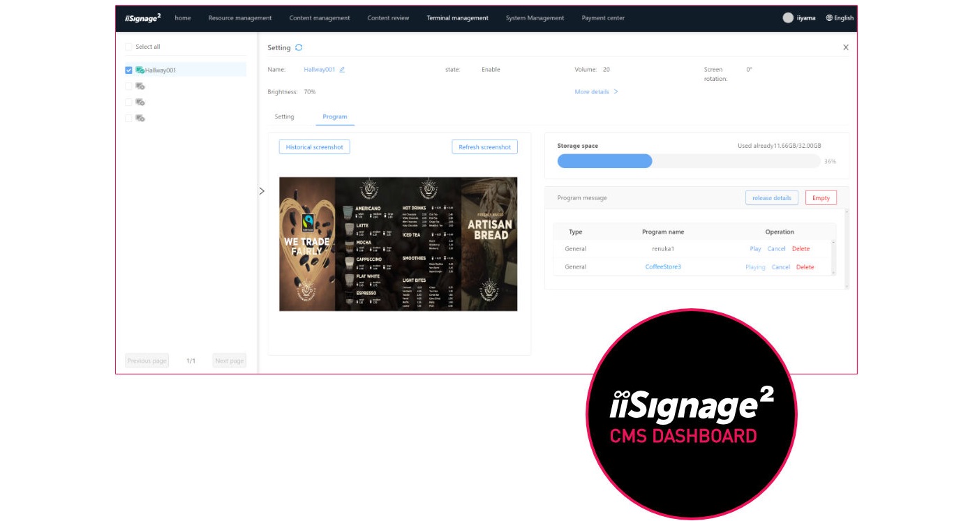iiSignage je platforma pro správu obsahu digitálních nápisů, která umožňuje snadno zobrazovat a ovládat obsah a bezpečně spravovat displeje. Systém pro správu obsahu (CMS) vám poskytuje úplnou kontrolu nad zobrazováním zpráv a reklamou na dálku a bezpečně.