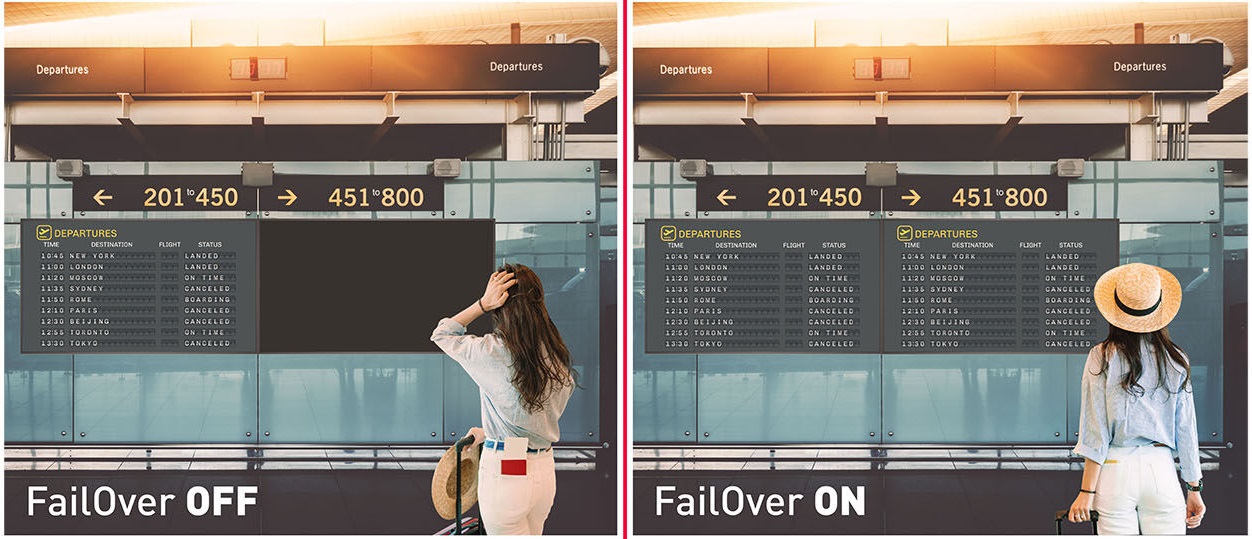 Funkce FailOver automaticky detekuje vstupní zdroje. Pokud na výchozím vstupu není žádný signál, automaticky se přepne na další dostupný vstup. Funkce FailOver umožňuje zákazníkům upřednostnit řadu vstupů (včetně prohlížeče, přehrávače médií a vlastního vstupu) a zajišťuje, že se obsah vždy aktivně zobrazuje a je vždy aktivní.