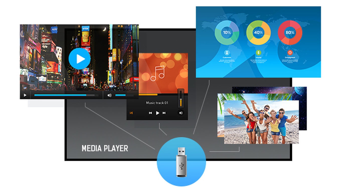 Přehrávejte svou oblíbenou hudbu a zobrazujte svá nejkrásnější videa, fotografie a obrázky přímo na obrazovce z flash disku nebo interní paměti pomocí vestavěného přehrávače médií.