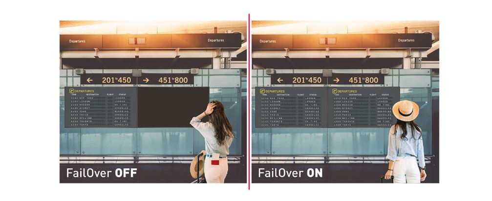 FailOver je funkce, která automaticky detekuje vstupní zdroje. Pokud na výchozím vstupu není žádný signál, automaticky přepne na další dostupný vstup. FailOver umožňuje zákazníkům upřednostnit řadu vstupů (včetně prohlížeče, přehrávače médií a vlastního) a zajišťuje, že váš obsah je vždy aktivně zobrazen, což zaručuje aktivní obsah po celou dobu.