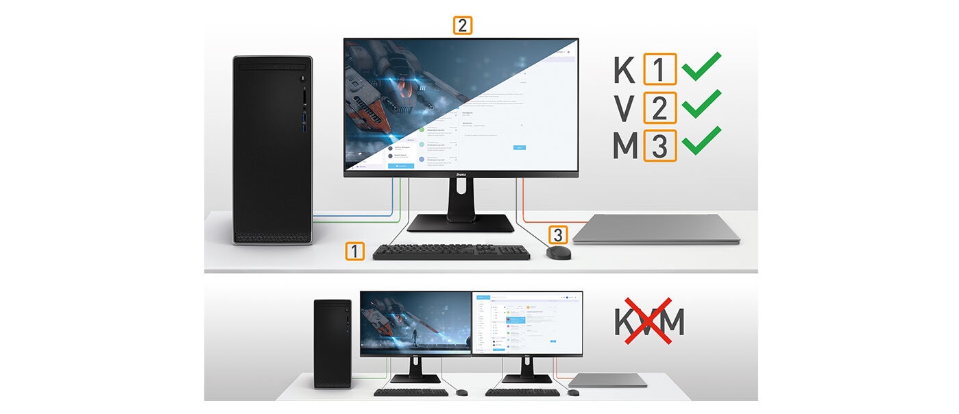 Monitor s přepínačem KVM umožňuje sdílet zařízení připojená k monitoru přes USB se dvěma různými počítači. Stačí změnit vstup signálu v nabídce OSD monitoru a klávesnice, myš a webová kamera se přepnou z pracovního notebooku na herní počítač.