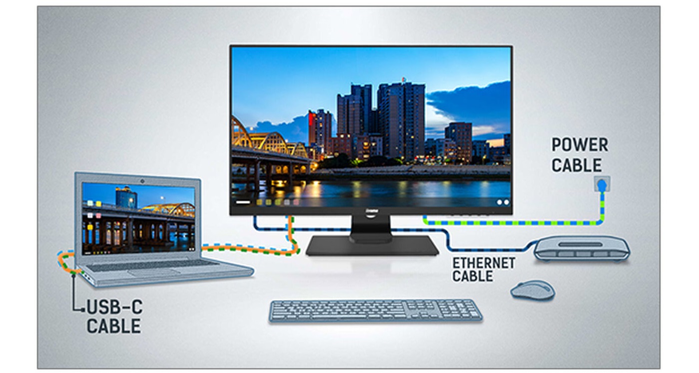 Dokovací stanice umožňuje připojit notebook jediným kabelem k monitoru, abyste měli jistotu, že je notebook nabitý a připojený ke kabelové síti a že signál z notebooku je přenášen do monitoru. Díky dalším portům USB lze k monitoru připojit také myš, klávesnici nebo webovou kameru. To vše díky jedinému kabelu připojujícímu notebook* k doku USB C v monitoru.
