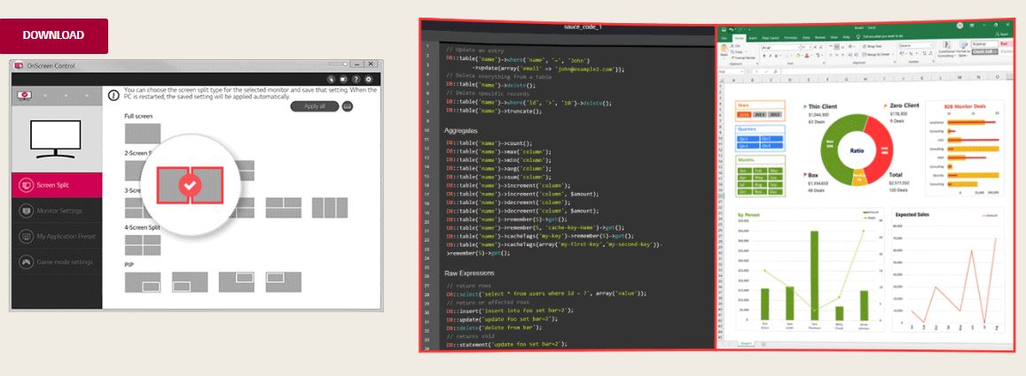 Software OnScreen Control přináší možnost měnit různá nastavení zobrazení pomocí několika kliknutí myši. Celou plochu displeje můžete také snadno rozdělit pomocí funkce Rozdělení obrazovky.