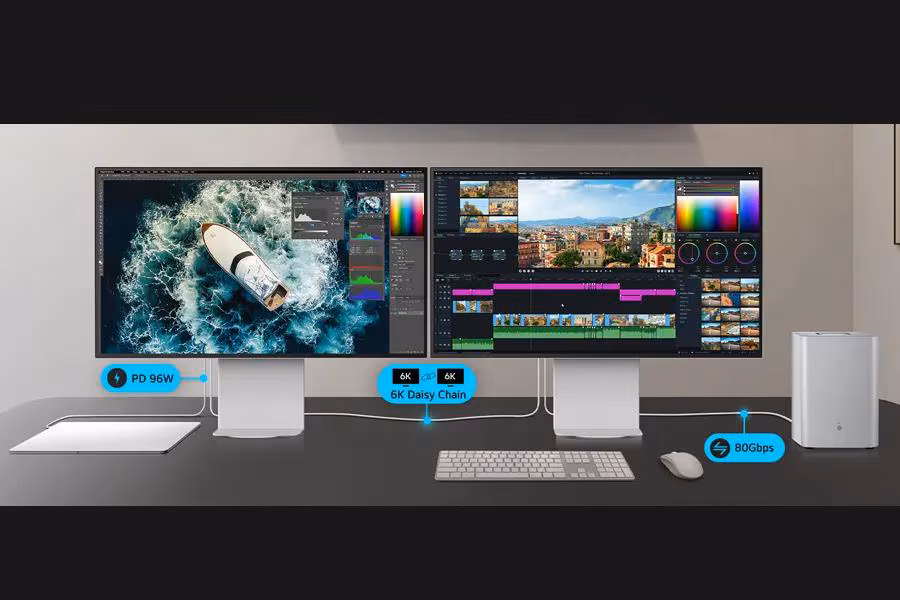Thunderbolt™ 5 poskytuje tvůrcům, editorům a profesionálům v oblasti umělé inteligence ultrarychlé přenosové rychlosti – dvakrát vyšší než u Thunderbolt™ 4, spolu s podporou řetězení 6K a DisplayPort 2.1 – to vše prostřednictvím jediného kabelu. S napájením 96 W a podporou Mac a Windows propojuje Thunderbolt™ 5 pracovní postupy připravené na budoucnost s maximální škálovatelností a efektivitou.