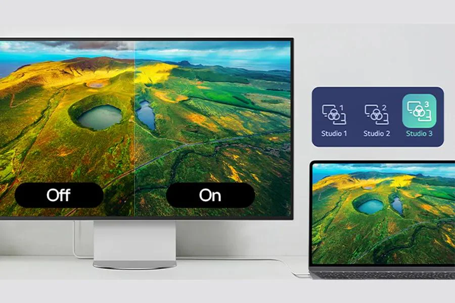 Režim Studio, navržený pro kompatibilitu s počítači Mac, nabízí tři kalibrované předvolby barev, které jemně ladí váš displej UltraFine evo 6K pro konzistentnější a jednotnější zážitek ze sledování. Upravuje jemné variace tónů a pomáhá zajistit, aby obrazovka zůstala konzistentní s vaším kreativním záměrem – od okraje k okraji.