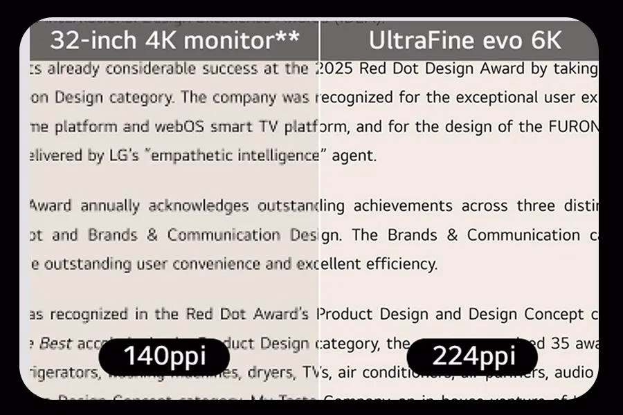 S rozlišením 6K (6144 × 3456) a ostrým rozlišením 224 PPI nabízí LG UltraFine™ evo více než 21 milionů pixelů na 32palcovém panelu, což je o 156 % více pixelů než u standardního rozlišení 4K. UltraFine™ evo má více pracovních pixelů na každý palec, což vám umožňuje prohlížet obsah v plném rozlišení a zároveň zachovat kreativní nástroje a editační rozhraní jasně viditelné, ostré a bez zkreslení.
