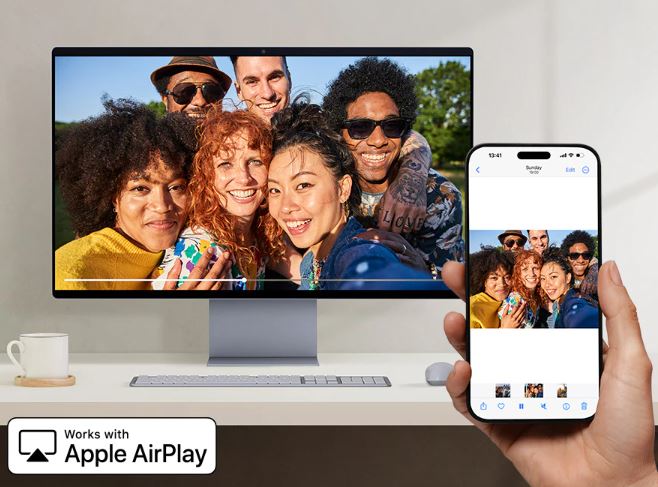 Připoj svá zařízení Apple přímo k monitoru a zobraz si z nich obsah na velké obrazovce. Integrovaná funkce AirPlay ti umožní jednoduše sledovat sociální sítě nebo zrcadlit aplikace, dokumenty a webové stránky z iPhonu, iPadu nebo Macu.