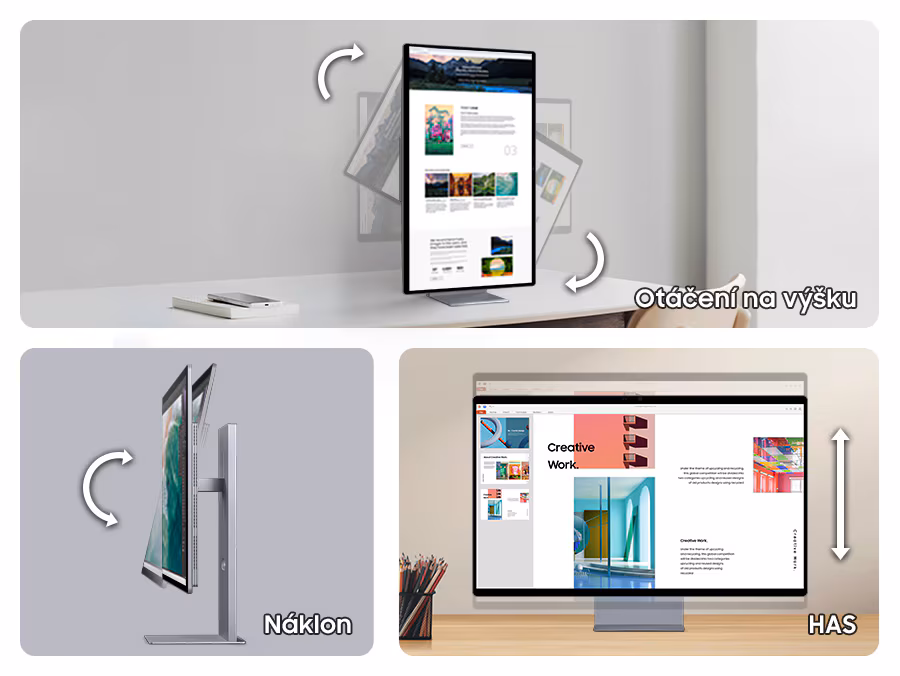 Monitor můžeš nastavit výškově, naklonit ho podle potřeby a otočit až o 90°, což ti umožní pohodlně číst dlouhé dokumenty bez neustálého scrollování myší.