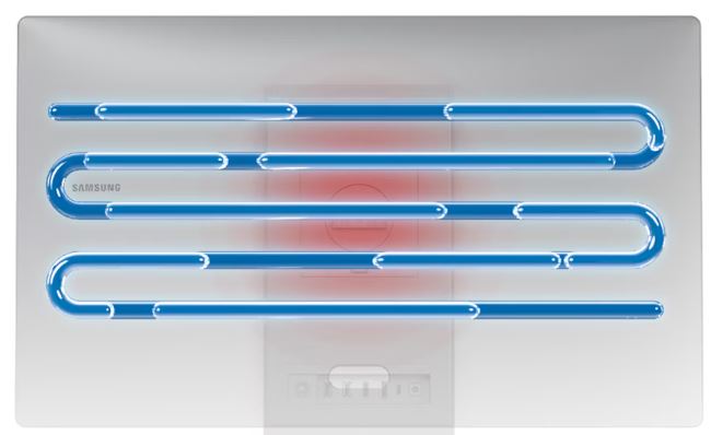 Pulzující tepelná trubice je vůbec poprvé integrovaná přímo do monitoru, kde uvolňuje chladicí kapalinu, která dokáže rozptylovat teplo 5× rychleji než grafitový list. Efektivně tak snižuje celkovou teplotu jádra a předchází vypalování obrazu.
