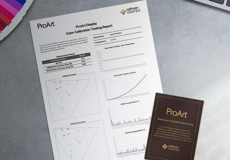 ProfesionálovĂ© v oblasti barev se spolĂ©hajĂ na displeje s pĹ™esnĂ˝m podánĂm barev, aby mÄ›li jistotu, Ĺľe jejich vĂ˝tvory budou vypadat pĹ™esnÄ› tak, jak zamýšleli. KaĹľdĂ˝ displej ProArt je kalibrován ve vĂ˝robÄ› tak, aby splĹoval standardy Calman Verified a dosahoval pĹ™esnosti barev Delta E<2.