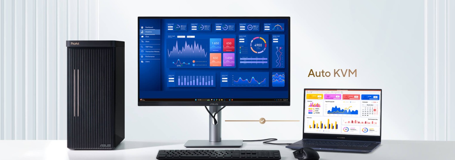 IntegrovanĂ˝ automatickĂ˝ KVM umoĹľĹuje snadnĂ© pĹ™epĂnánĂ a ovládánĂ mezi dvÄ›ma pĹ™ipojenĂ˝mi notebooky nebo poÄŤĂtaÄŤi pomocĂ jednĂ© klávesnice a myši, coĹľ usnadĹuje multitasking.