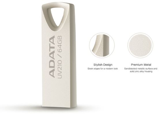 USB flash disk UV210 schovaný v hladkém plášti ze slitiny zinku s povrchovou úpravou v honosné šampaňské zlaté představuje stylovou jednoduchost s odolností. Díky precizní technologii, designu bez uzávěru a velkému upevňovacímu řemínku nabízí UV210 kombinaci profesionálního vzhledu a jednoduchého používání. Díky atraktivní vnější úpravě a snadné přenositelnosti nejde jen o USB flash disk, ale přímo o módní doplněk pro každodenní použití.