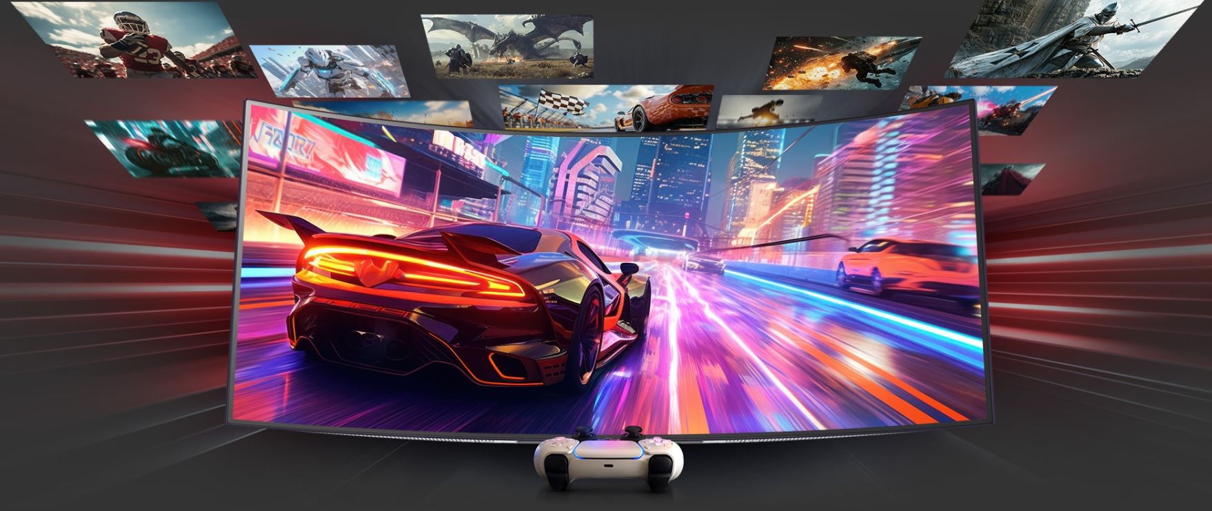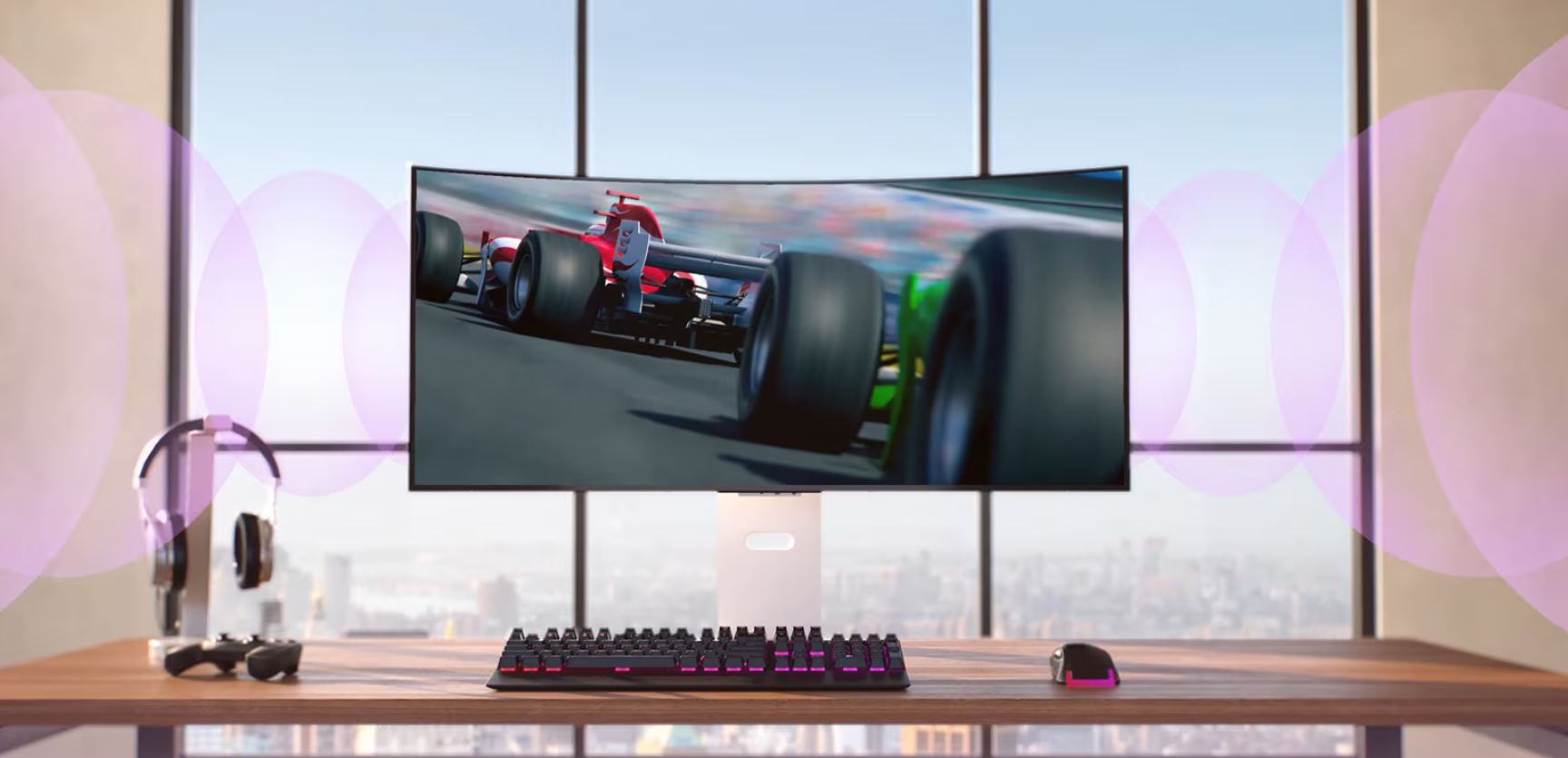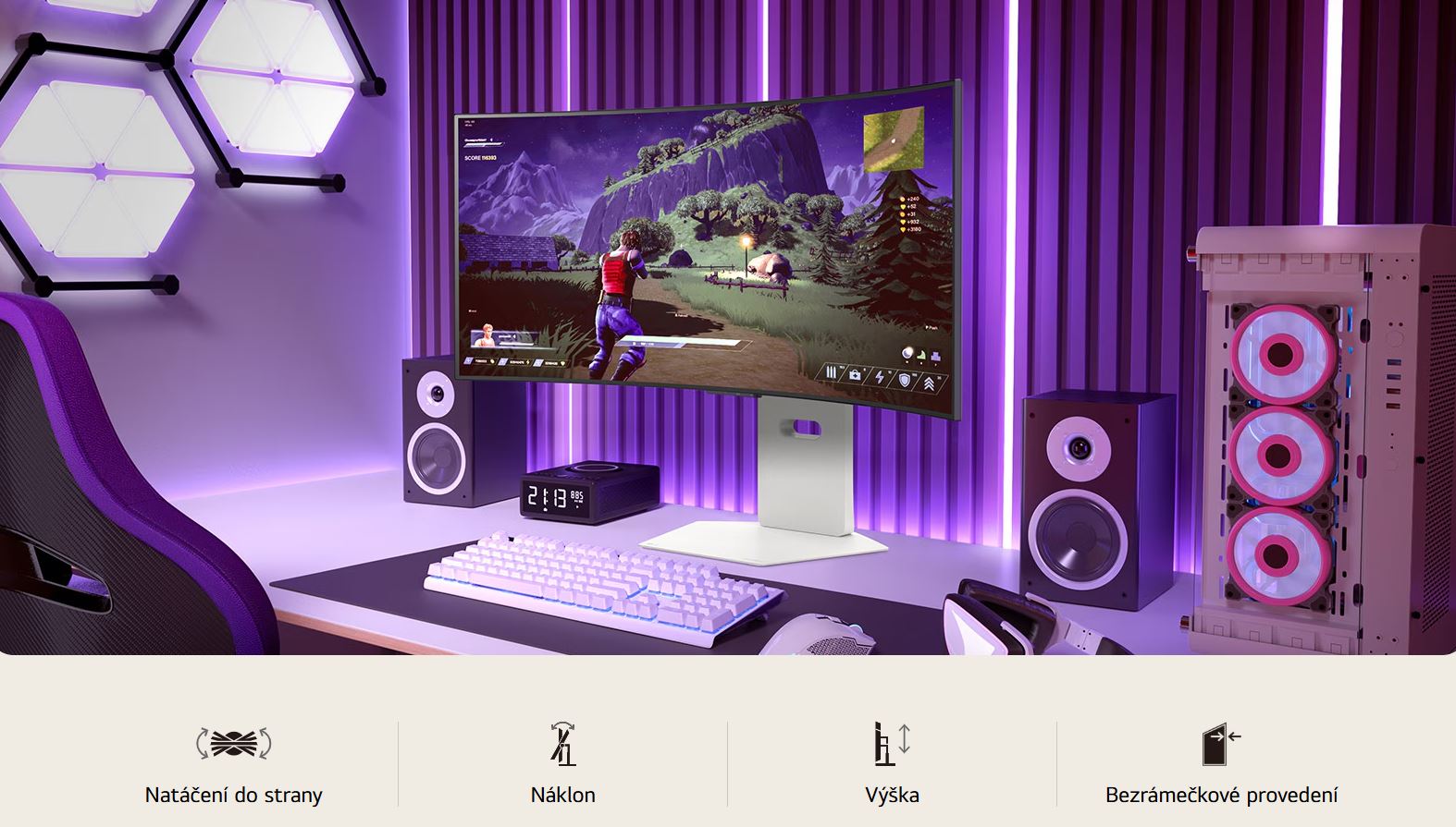 ZakĹ™ivenĂ˝ monitor OLED nabĂzĂ dĂky vyváženĂ©mu a optimalizovanĂ©mu pomÄ›ru stran 21:9 pohlcujĂcĂ a podmanivĂ˝ zážitek pĹ™i hranĂ her i sledovánĂ rĹŻznĂ©ho zábavnĂho obsahu.