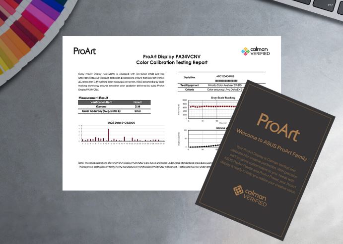 Každý displej ProArt je z výroby předkalibrován pomocí nového třístupňového procesu, aby byla zaručena špičková barevná věrnost. Displej poté prochází přísným testováním pomocí pokročilé technologie sledování ve stupních šedi od společnosti ASUS, která zajišťuje hladší barevné přechody, lepší jednotnost a vysokou přesnost barev s rozdílem barev Delta E menší než 2.