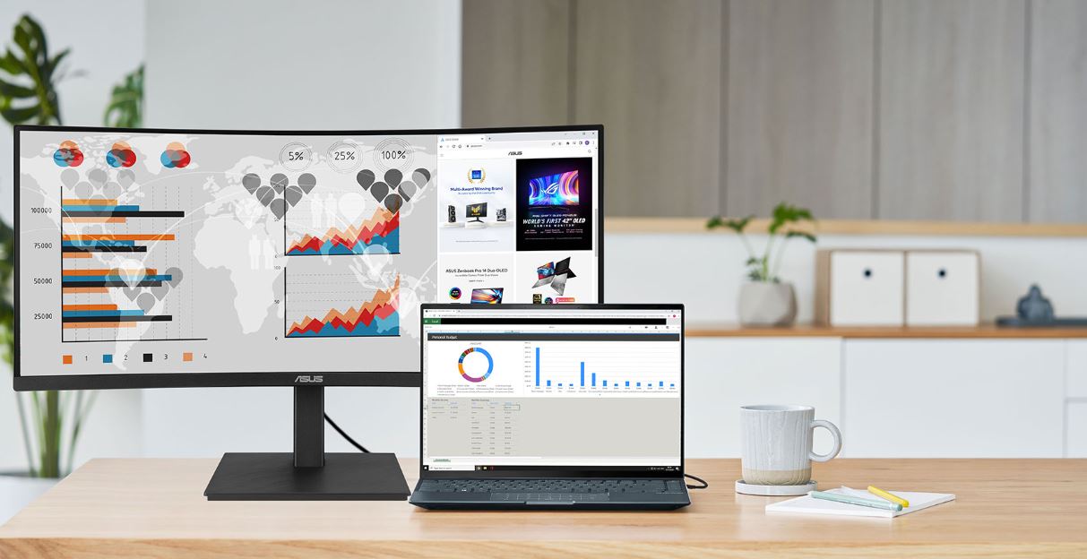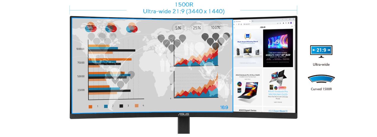 ASUS VA34VCPSR je 34palcový zakřivený dokovací monitor s poměrem stran 21:9 (3440 x 1440), který poskytuje neuvěřitelně ostrý obraz a díky mimořádné šířce usnadňuje multitasking. Stabilní internetové připojení a dokování jediným kabelem k notebooku zajišťují konektory RJ45 a USB-C. Obnovovací frekvence až 100 Hz s technologií Adaptive-Sync eliminuje trhání a zajišťuje ostrý a plynulý obraz. Vysoce ergonomický design spolu s funkcemi Flicker-free a Low Blue Light certifikovanými organizací TÜV Rheinland se postarají o maximálně pohodlné sledování.