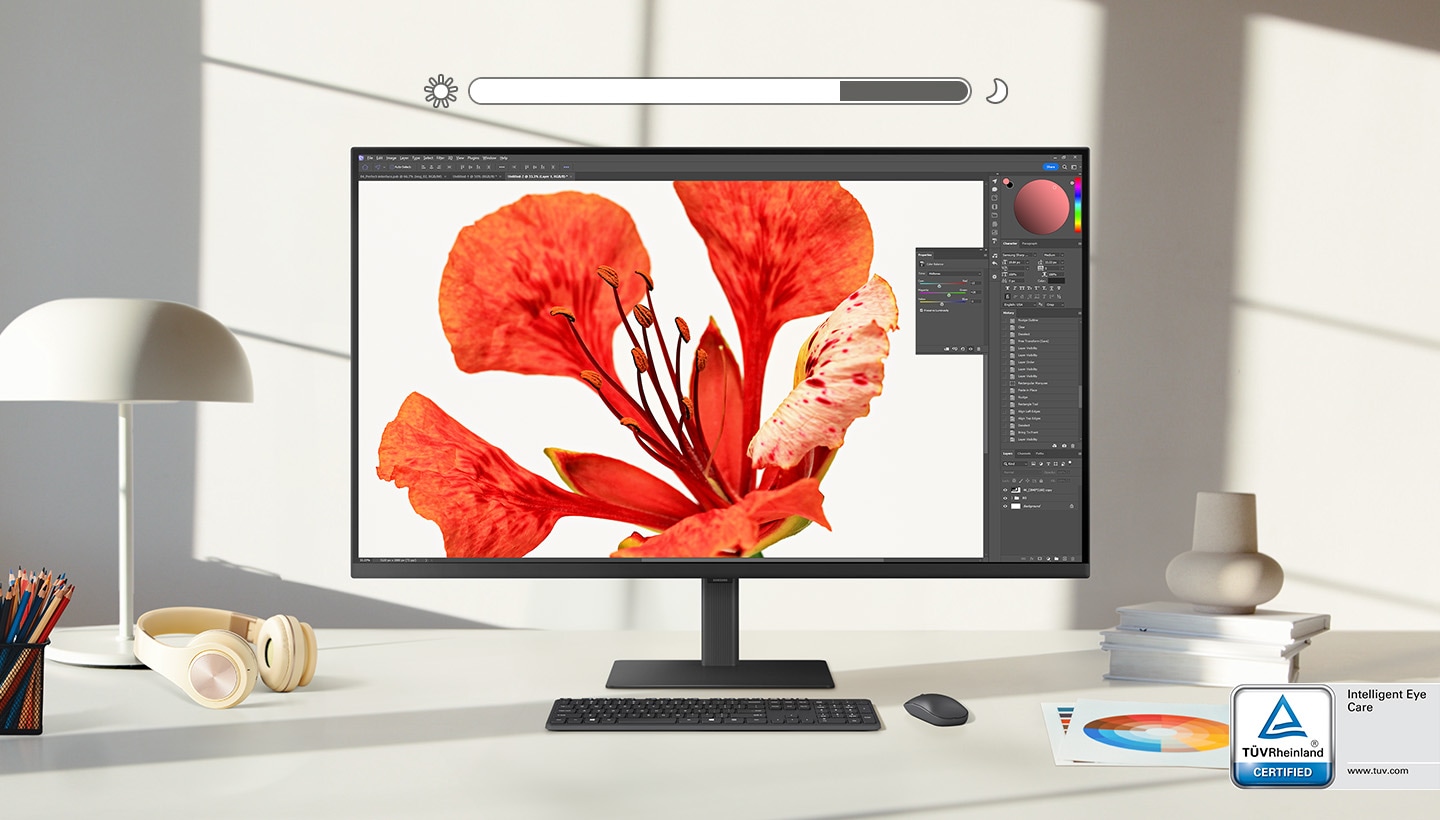 Udržíš si oči svěží po dlouhé hodiny sledování. Při práci na nočních projektech nebo za oblačného počasí se jas a teplota barev automaticky optimalizují podle okolního prostředí. S inteligentní ochranou zraku s certifikací TUV monitor Samsung snižuje blikání obrazovky a chrání oči před nežádoucími účinky krátkovlnných paprsků modrého světla.