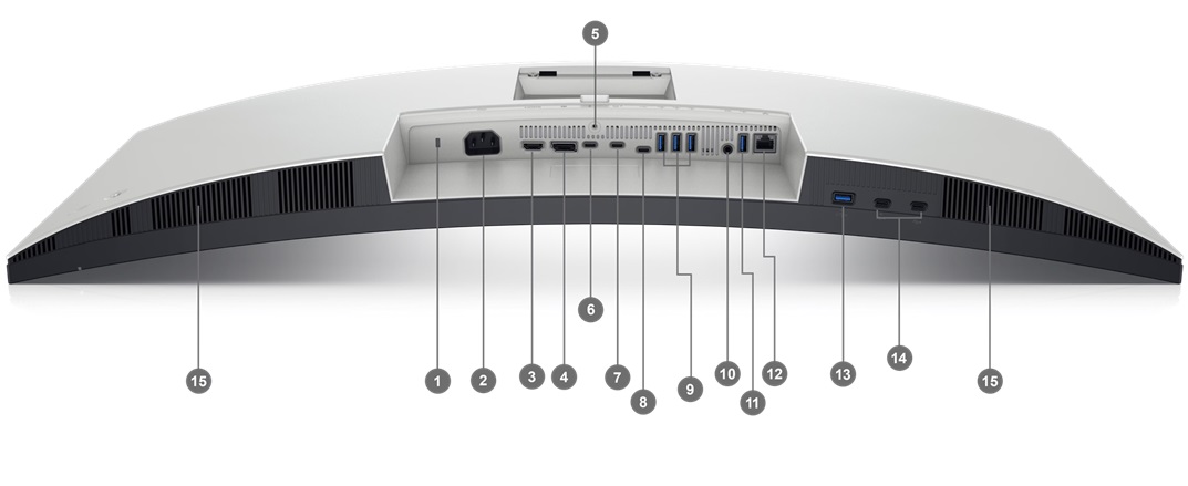 1. Slot pro bezpečnostní zámek (na bázi Kensington Security Slot) | 2. Konektor napájení | 3. Port HDMI | 4. DisplayPort 1.4 | 5. Zámek stojanu | 6. Thunderbolt 4 downstream port (15 W) pro řetězení | 7. Thunderbolt 4 upstream port (video + data). Alternativní režim s DisplayPortem 1.4, napájení až 90 W | 8. Upstream port USB Type-C (pouze data) (SuperSpeed USB 10 Gb/s, USB 3.2 Gen 2) | 9. 3x USB Type-A downstream port (SuperSpeed USB 10 Gbps, USB 3.2 Gen 2) | 10. Výstup zvuku | 11. Port USB typu A downstream (SuperSpeed USB 10 Gb/s, USB 3.2 Gen 2) | 12. Port RJ45 | 13. Port USB typu A downstream (SuperSpeed USB 10 Gb/s, USB 3.2 Gen 2) s nabíjením BC1.2 | 14. 2x USB Type-C downstream port (SuperSpeed USB 10 Gbps, USB 3.2 Gen 2) s nabíjením z napájení (15 W) | 15. Reproduktory