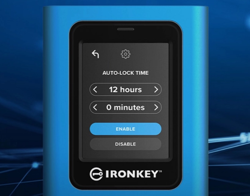 Nastavitelný automatický časový limit pro uzamčení disku, náhodné rozložení dotykové obrazovky a Secure-Erase disku pro vymazání všech hesel a šifrovacího klíče.