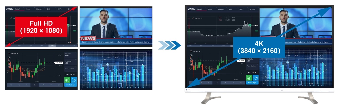 Monitor podporuje rozlišení až 4K (3840 x 2160 pixelů), které na prostorné 42,5palcové obrazovce zobrazuje čtyřikrát více informací než standardní rozlišení Full HD (1920 x 1080 pixelů). To poskytuje více prostoru pro flexibilní uspořádání více aplikací bez rušivých rámečků charakteristických pro sestavy s více monitory.