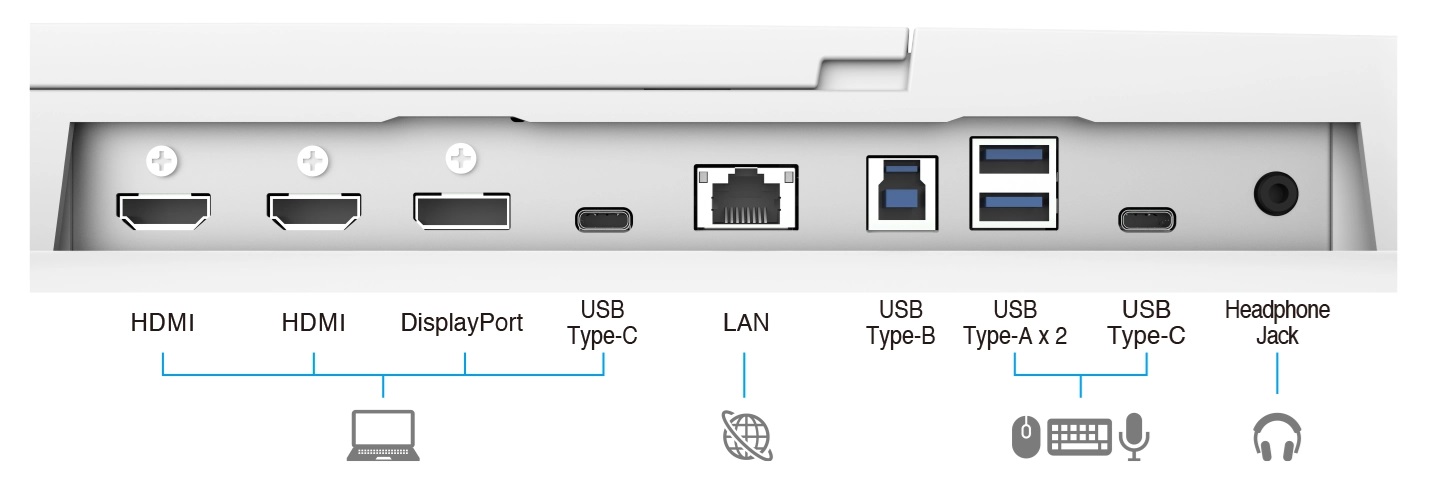 Monitor je vybaven porty USB typu C, DisplayPort a dvěma porty HDMI pro snadné připojení k více zařízením, takže je vhodný pro hot desking a zasedací místnosti.