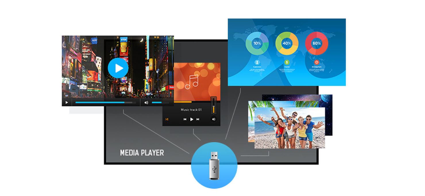 Přehrajte svou oblíbenou hudbu, ukažte ty nejúžasnější propagační videa, fotky a jiné obrázky přímo na obrazovku. Z vloženého flash disku nebo interní pamětí, za pomocí vestavěného přehravače médii.