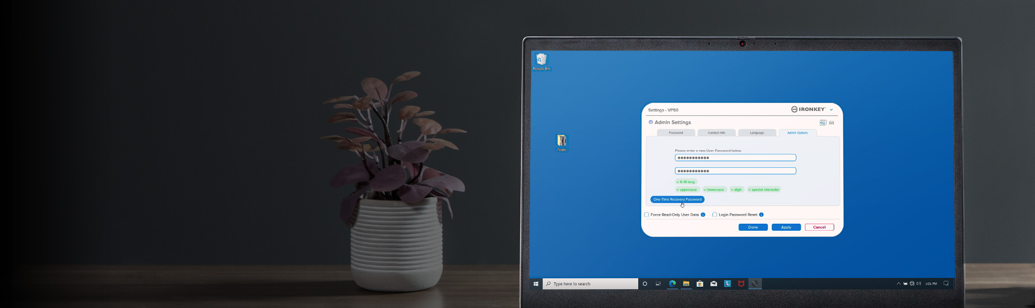 Povolte hesla správce, uĹľivatele a jednorázovĂ© obnovenĂ. Správce mĹŻĹľe resetovat heslo uĹľivatele a vytvoĹ™it heslo pro jednorázovou obnovu, aby obnovil pĹ™Ăstup uĹľivatele k datĹŻm. Ochrana proti ĂştokĹŻm hrubou silou zablokuje hesla User nebo One-Time Recovery pĹ™i 10 nesprávnĂ˝ch heslech zadanĂ˝ch v Ĺ™adÄ› a kryptografickĂ© vymazánĂ jednotky, pokud je heslo Admin zadáno 10krát za sebou nesprávnÄ›.
