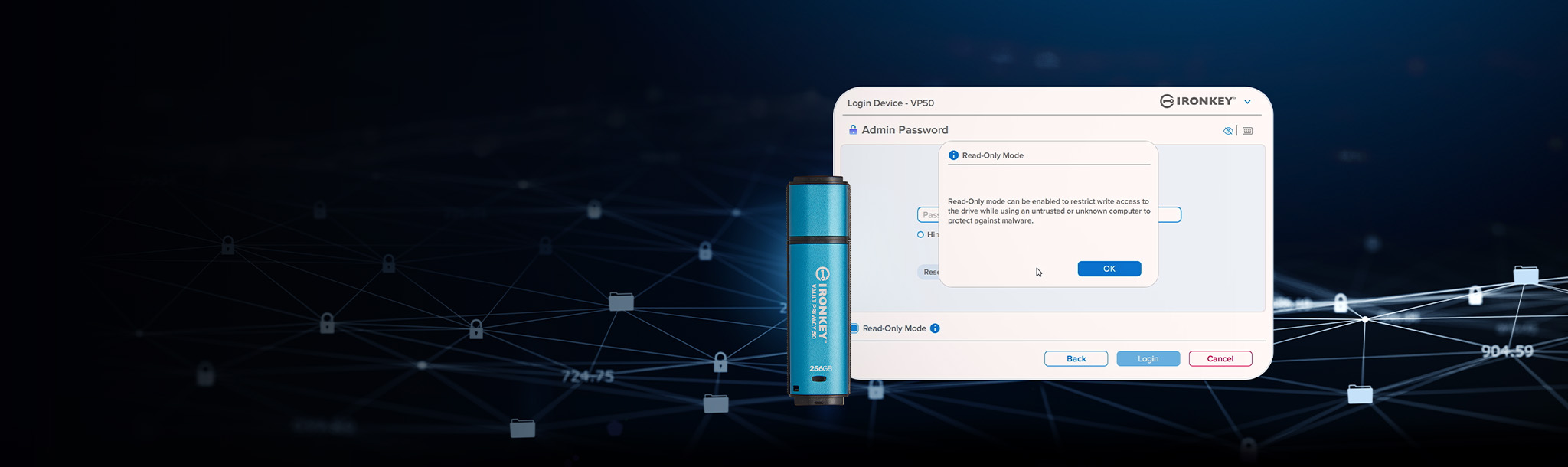 Pro ochranu před potenciálním malwarem na nedůvěryhodných systémech může správce i uživatel nastavit režim pouze pro čtení, aby byl disk chráněn proti zápisu; vestavěná virtuální klávesnice navíc chrání hesla před keyloggery nebo screenloggery.