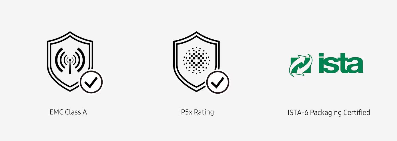 Řada VMC-R splňuje požadavky třídy EMC B a přísné normy pro emisi elektromagnetického záření, zatímco certifikace IP5x chrání displej před prachem a dalšími vlivy. Balení displeje také prošlo přísným čtyřstupňovým testem certifikovaným ISTA, aby se minimalizovalo možné poškození během přepravy.